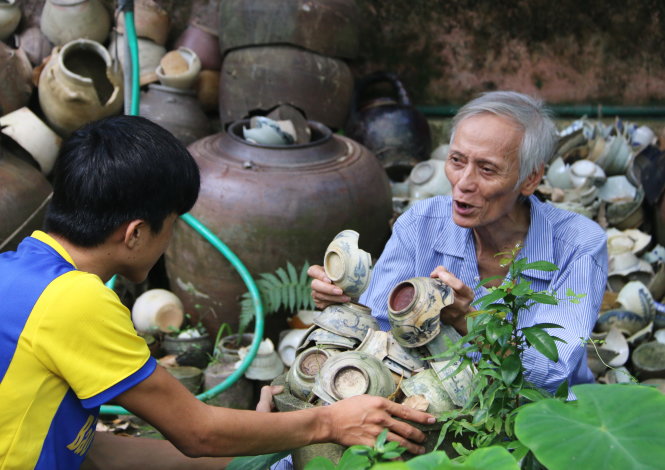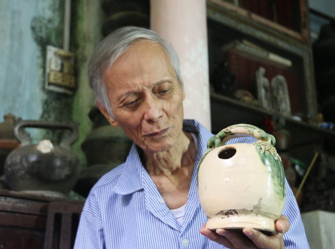 Nhà nghiên cứu Hồ Tấn Phan và lô đồ Chu Đậu đang để ở sân vườn - Ảnh: Thái Lộc