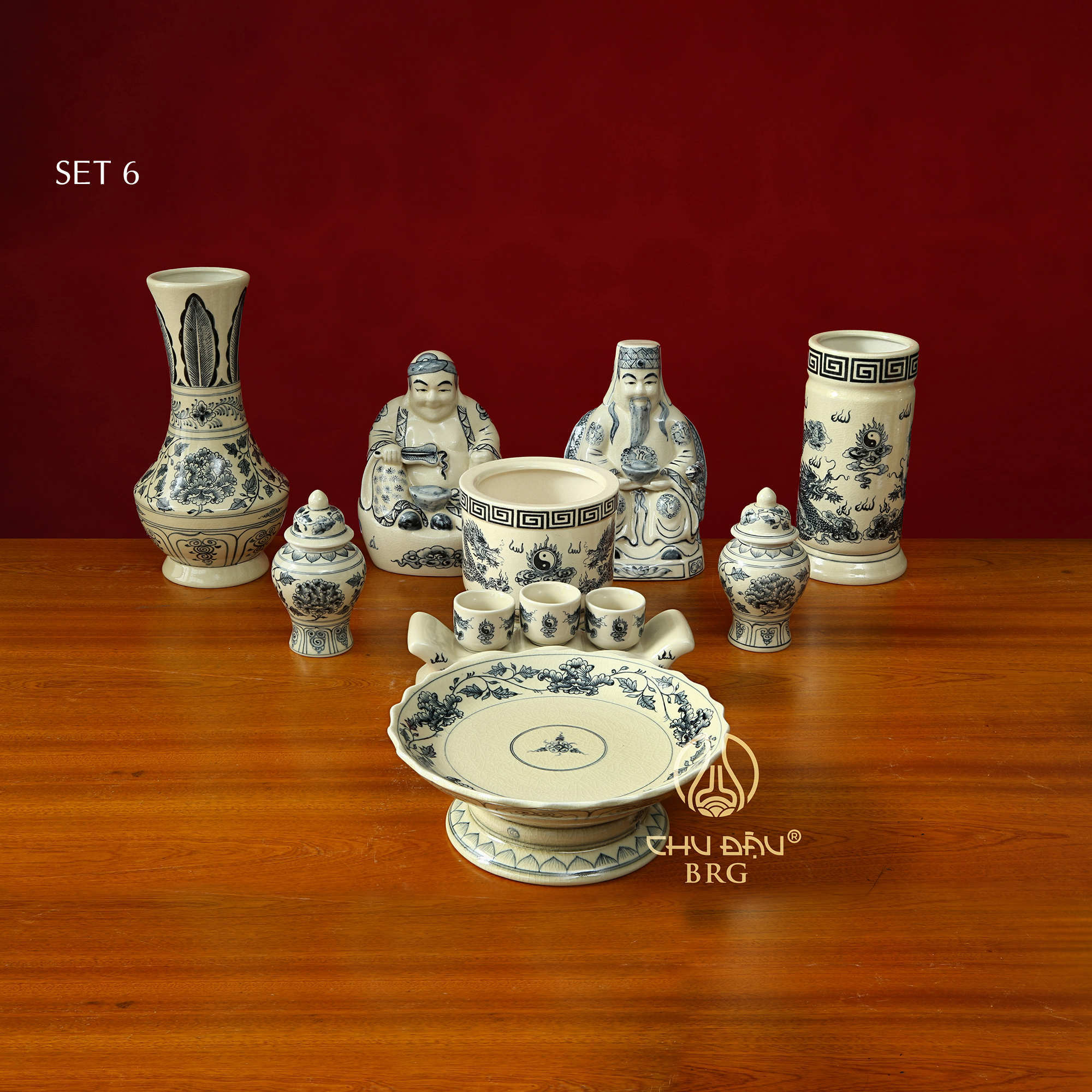 Bộ đồ thờ 15 sản phẩm bao gồm: bát hương, bộ đỉnh hạc, chĩnh thờ, lộc bình, nậm rượu, chén thờ, hạc nến, đèn dầu, đỉnh thờ, mâm bồng, ống hương, lư hương,bộ chén thờ, khay trầu cau,lọ hoa gốm, được chế tác và thiết kế vô cùng cẩn thận và tỉ mẩn từ các nghệ nhân. Từ khâu chọn đất, những viên đất được chọn lựa kĩ càng từ vùng đất Chí Linh, sau đó đưa về làng qua nhiều công đoạn nghiền, trộn, ủ, đúc khuôn mới mang đến được những sản phẩm gốm men rạn chỉ riêng gốm Chu Đậu mới có.
