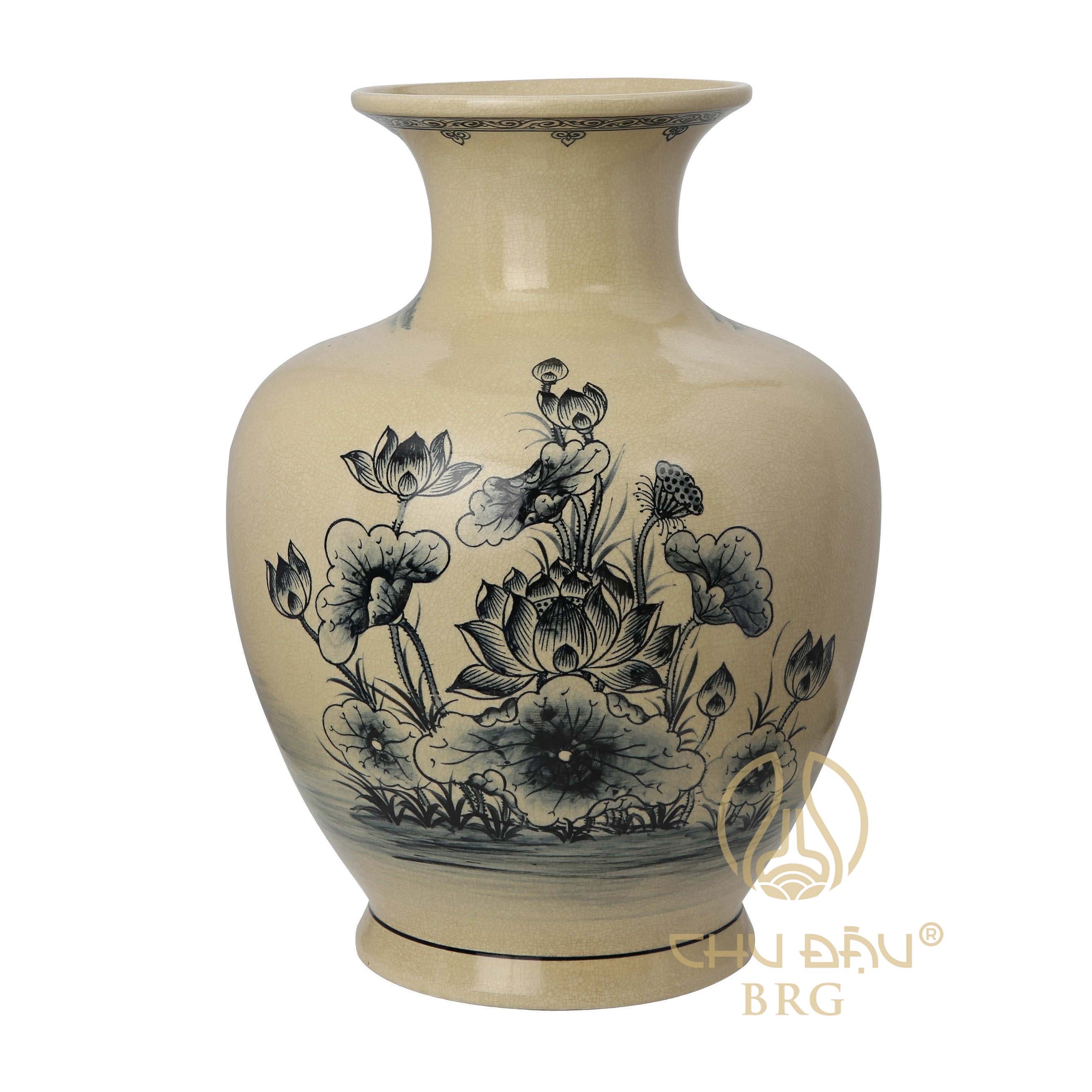 Bình bảo liên Gốm Chu Đậu - Thương hiệu Quốc gia được nghệ nhân phục dựng theo chiếc bình gốm cổ Chu Đậu, phù hợp để cắm hoa hoặc trang trí. Liên hệ 0969.655.095 để được tư vấn.