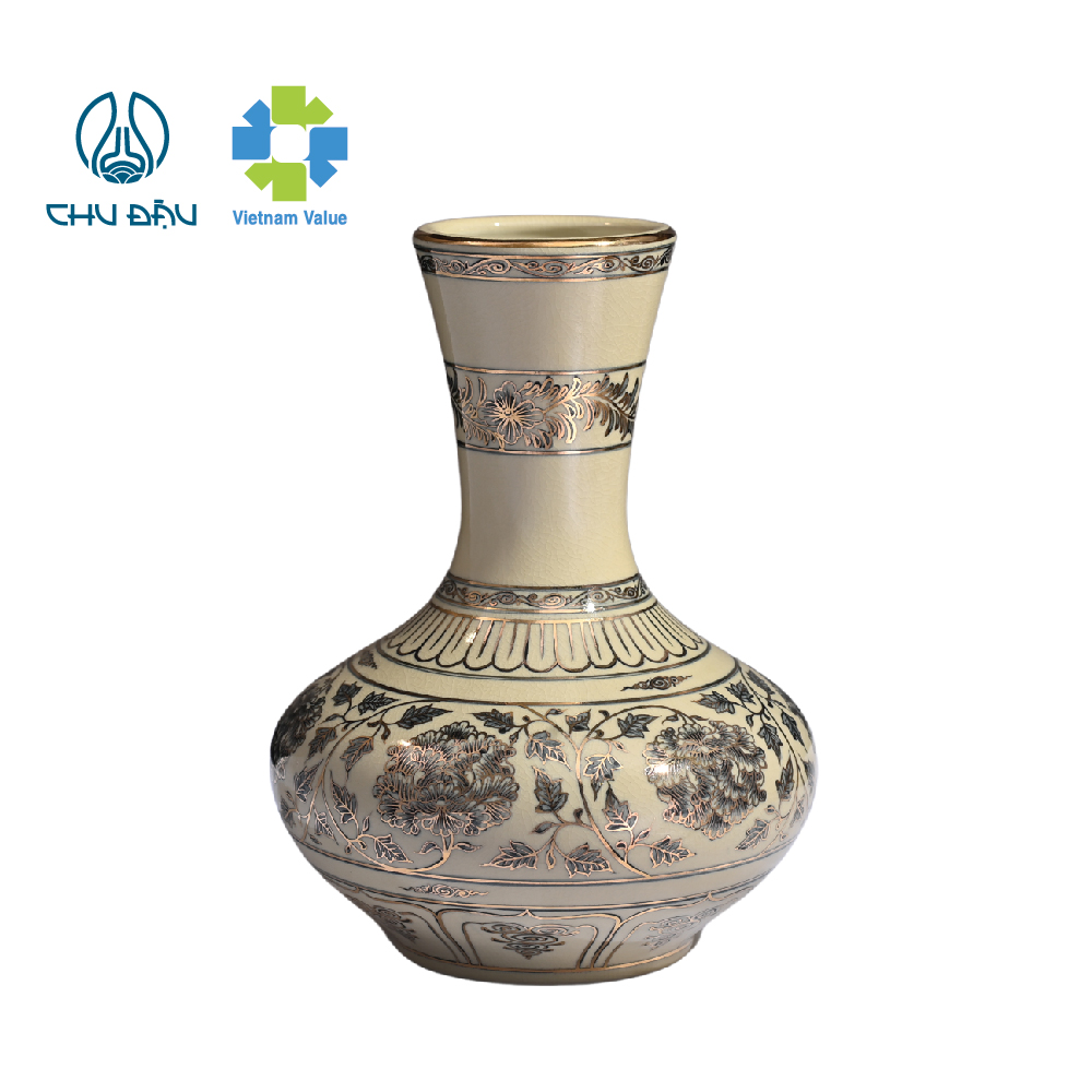 Bình hoa Cúc Quân Tử vàng kim Gốm Chu Đậu BRG được nghệ nhân gốm Chu Đậu phỏng theo chiếc bình cổ triều Trần - Lê Sơ (thế kỷ XIV - XV). Với kiểu dáng độc đáo, bố cục chặt chẽ, thân tròn miệng cao, chiếc bình được ví như tấm lòng, khí tiết kiên trung của người quân tử.