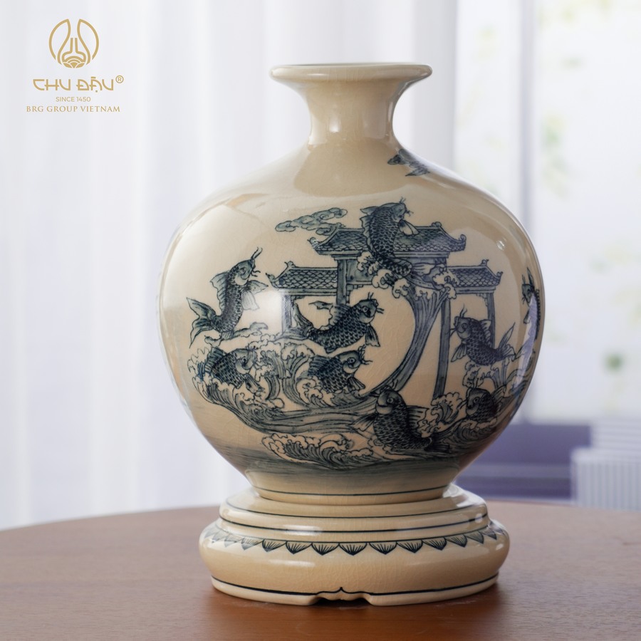 Bình Giọt Ngọc gốm Chu Đậu họa tiết cá chép vượt vũ môn được nghệ nhân gốm Chu Đậu phỏng theo chiếc bình gốm cổ Chu Đậu triều Trần – Lê Sơ ( thế kỷ XIV – XV) có dáng tròn tượng trưng cho Trời, Đất, vũ trụ, cho người thành đạt, cho sự hoàn hảo. Với hình dáng thân to, miệng nhỏ, chiếc bình được ví như hầu bao, hồ lô hút tiền, mang lại vượng khí tốt cho gia chủ.
