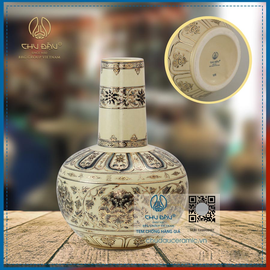 Bình hoa lam gốm Chu Đậu vẽ vàng kim