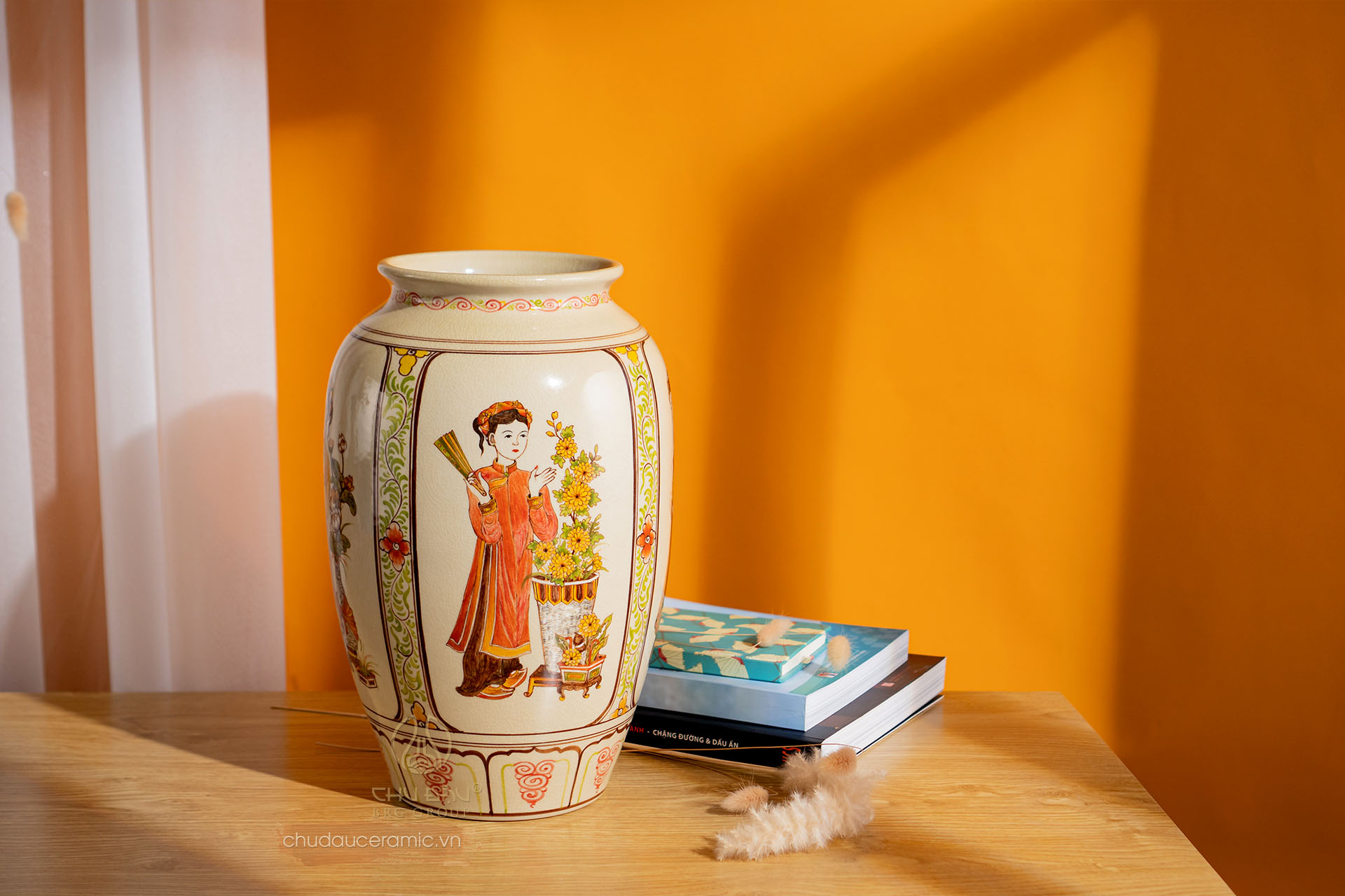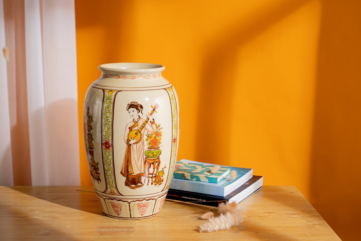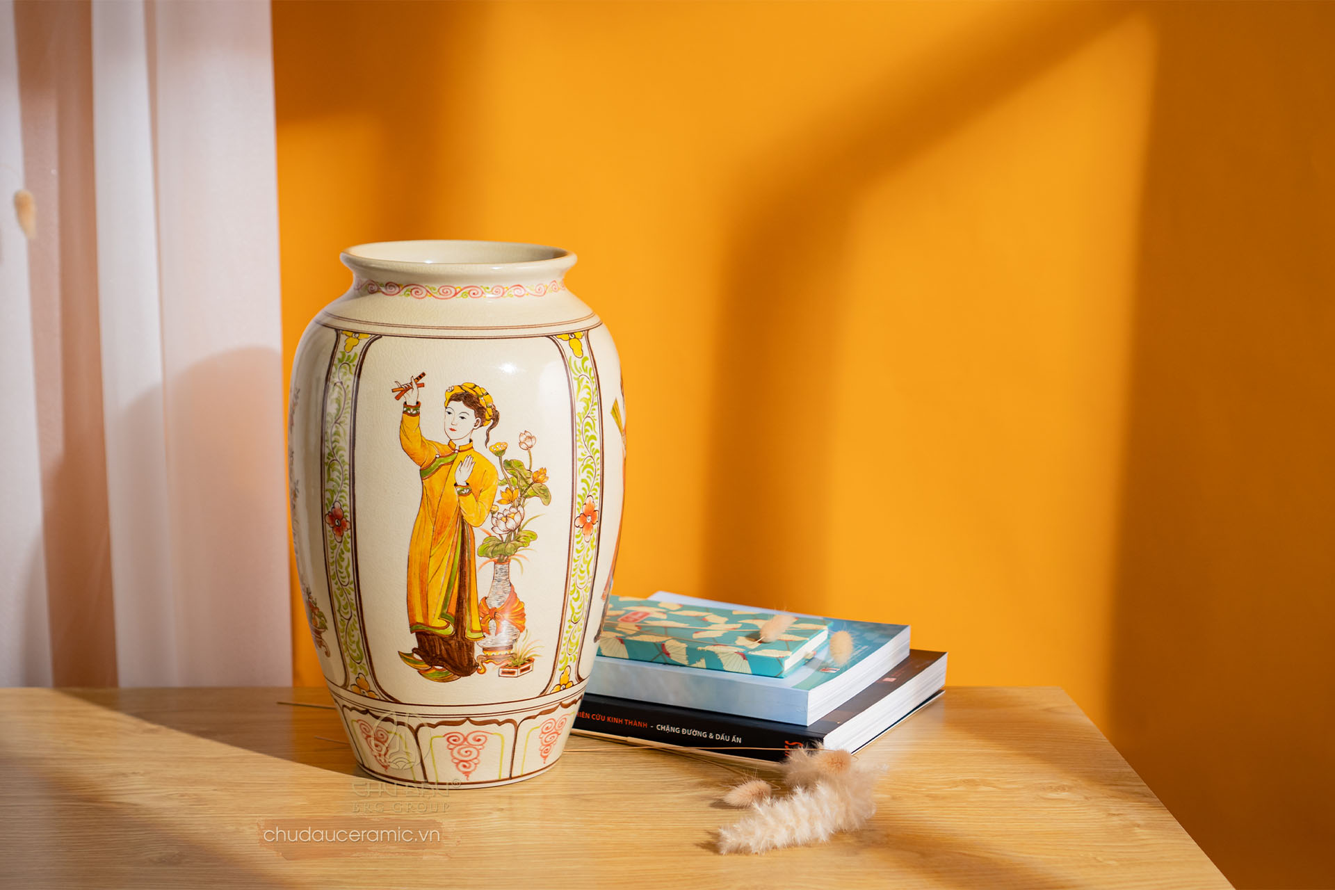 Bình Hoàng sen Tố nữ gốm Chu Đậu được các nghệ nhân lấy cảm hứng từ bộ tranh Tứ bình Tố Nữ nổi tiếng để khắc họa vẻ đẹp của người phụ nữ Việt Nam trên chất liệu gốm Chu Đậu nổi tiếng. Liên hệ 0969.655.095 để nhận ưu đãi sớm nhất.
