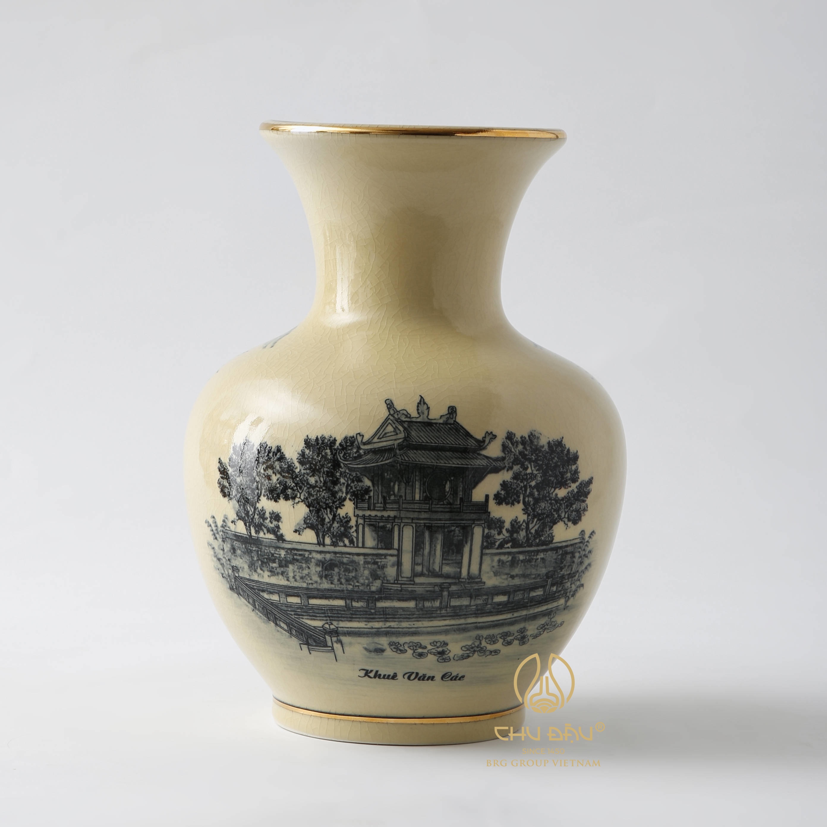 Họa tiết chủ đạo được Nghệ nhân gốm Chu Đậu trang trí lên bình là hình ảnh Khuê Văn Các, hoa phượng đỏ, người lái đò và lời chúc đầy sâu sắc, ý nghĩa của các thế hệ học trò tới thầy cô giáo.