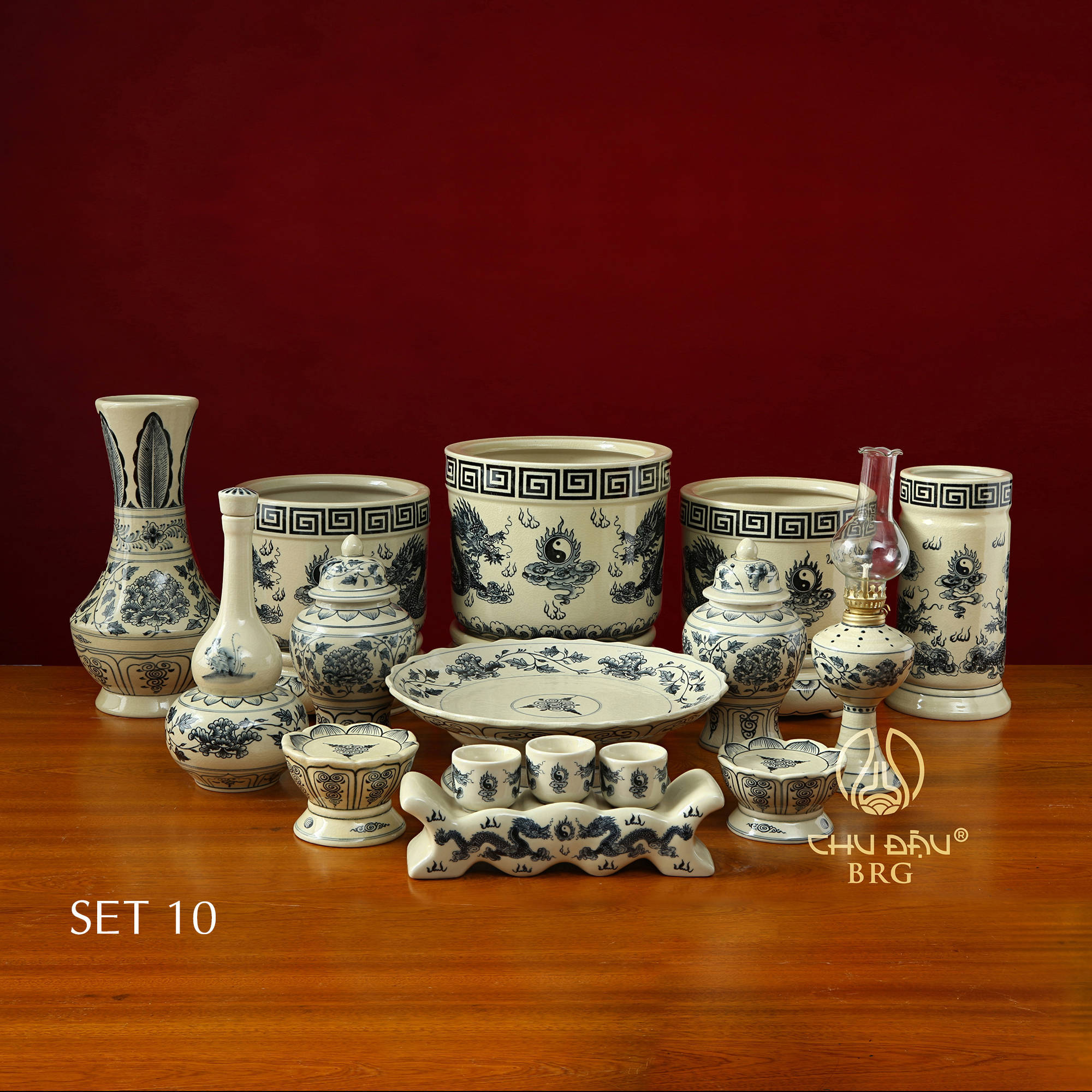 Bộ đồ thờ bao gồm: bát hương, chĩnh thờ, nậm rượu, chân nến, đèn dầu, mâm bồng, ống hương, bộ chén thờ, lọ hoa gốm, được chế tác và thiết kế vô cùng cẩn thận và tỉ mẩn từ các nghệ nhân. Từ khâu chọn đất, những viên đất được chọn lựa kĩ càng từ vùng đất Chí Linh, sau đó đưa về làng qua nhiều công đoạn nghiền, trộn, ủ, đúc khuôn mới mang đến được những sản phẩm gốm men rạn chỉ riêng gốm Chu Đậu mới có.