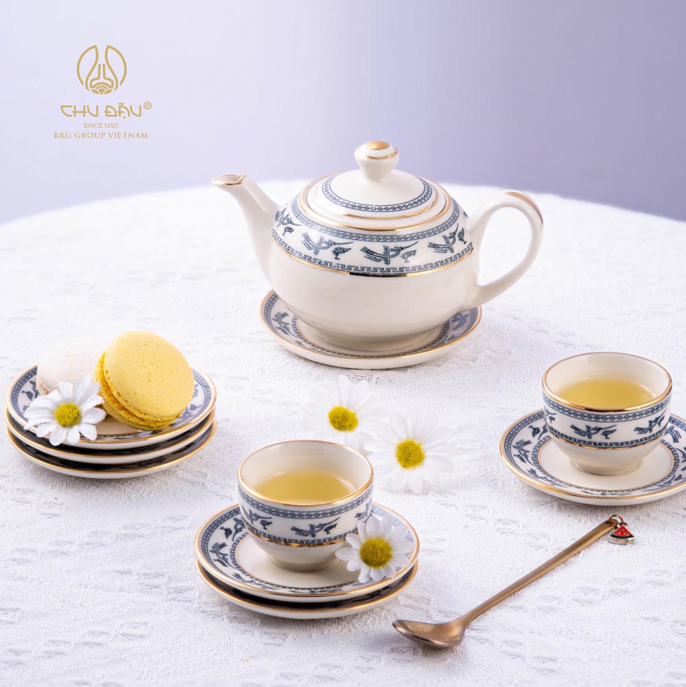 Bộ trà trường an viền vàng vẽ chim lạc Gốm Chu Đậu - Thương hiệu Quốc gia với kiểu dáng cổ điển, hoa văn tươi mới tạo phong cách riêng trong văn hóa thưởng trà. Liên hệ 0969.655.095 để nhận ưu đãi mới nhất.