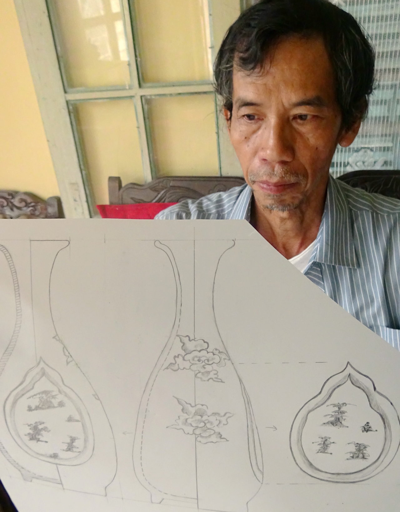 Mở các vali, ông lần giở từng xấp giấy “can” được đặt riêng theo từng chủng loại, từ chén đĩa, kendy hay ấm trà, ang, hũ hộp phấn. Nhiều tập thì toàn vẽ cá hay những loài linh thú. Có tập vẽ người, phong cảnh hoặc kiến trúc...