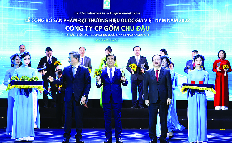 Ông Nguyễn Hữu Thức, Giám Đốc Công ty cổ phần gốm Chu Đậu (giữa) nhận danh hiệu Thương hiệu quốc gia 2022