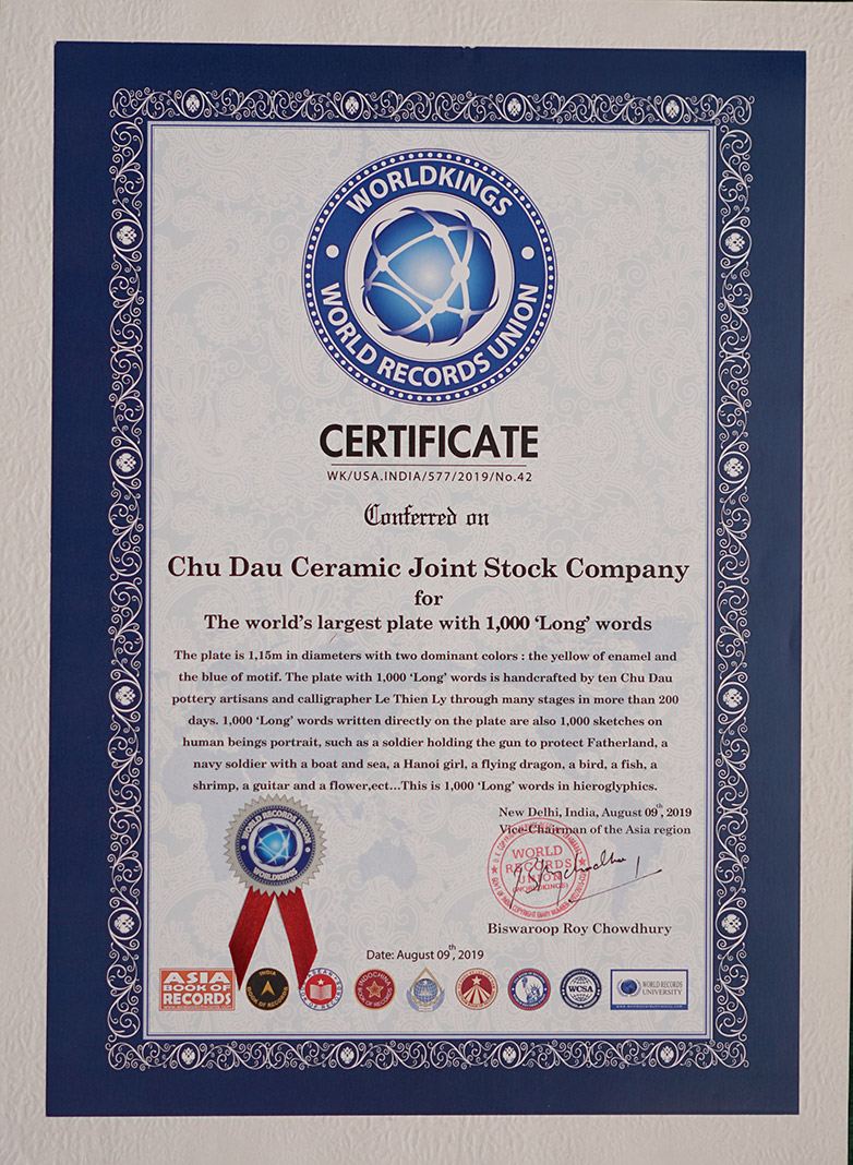 1000 năm Thăng Long – Hà Nội: 1000 chữ Long trong chất men của Gốm Chu Đậu là những viên ngọc trai sáng lung linh kết thành chuỗi ngọc trai huyền thoại. Chữ Long biểu trưng cho sức mạnh siêu việt, cho quyền lực, cho chiến thắng và niềm tin, nó tràn đầy nghị lực và khí lực. Chữ Long ấy có ở trong mỗi con người chúng ta, chắp cánh cho ta bay cao, bay xa.