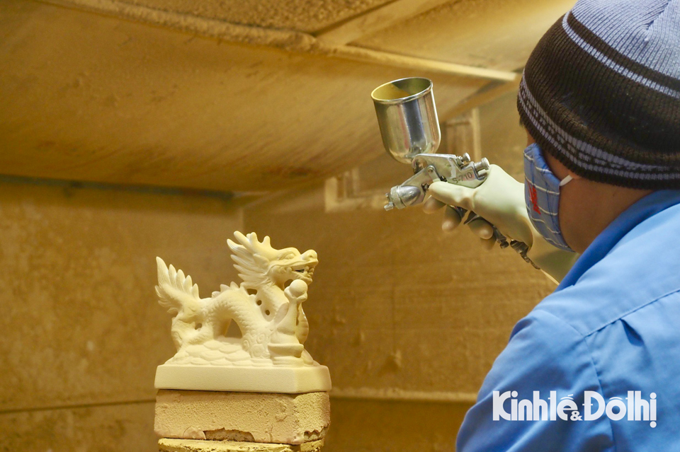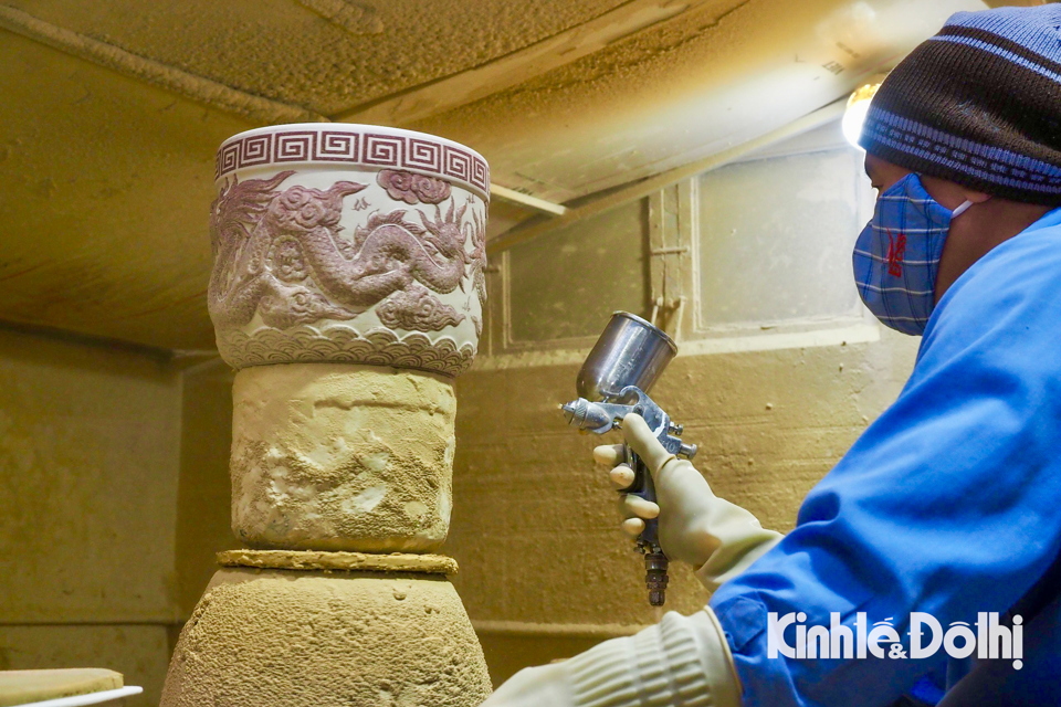 Sau khi tạo khung và sửa sang các chi tiết, công đoạn tiếp theo người công nhân mang đi phun/tráng men lên các tác phẩm.