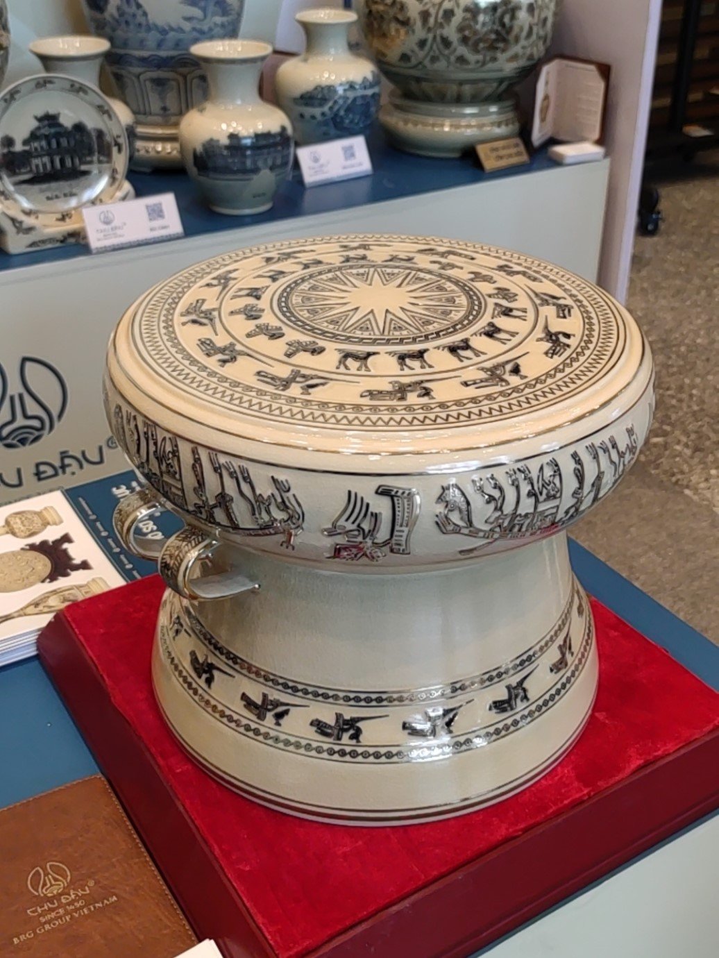 Trống đồng đắp nổi vàng kim gốm Chu Đậu