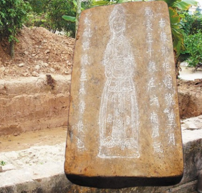 Hố khai quật và viên gạch có khắc hình tượng bà Bùi Thị Hý