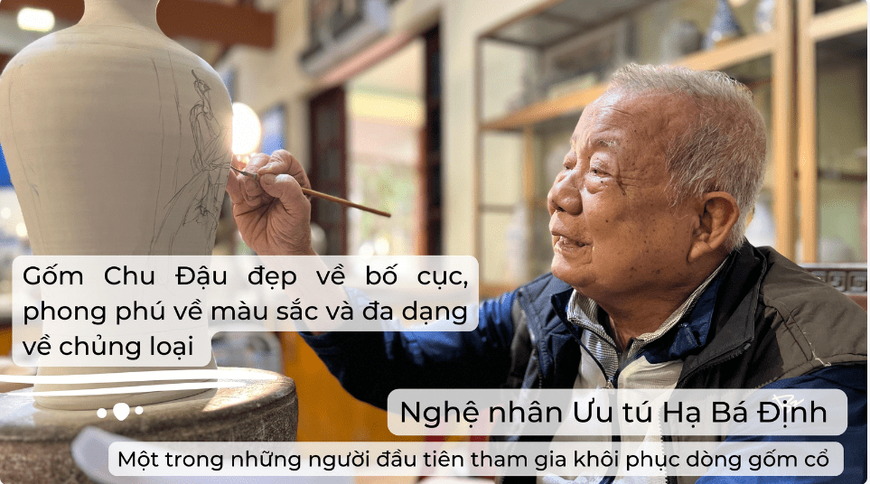 Là một trong những người đầu tiên tham gia khôi phục dòng gốm cổ, nghệ nhân Hạ Bá Định nhận xét, gốm Chu Đậu là thành quả chắt lọc từ những nghiên cứu rất kỹ về mỹ thuật và kỹ thuật của các nghệ nhân làm gốm xưa. Các nét vẽ trên gốm Chu Đậu không bị gò bó, khuôn phép như các dòng gốm cổ Trung Quốc mà tự do, bay bổng, mềm mại, hiền hoà nên có tính lãng mạn rất cao.