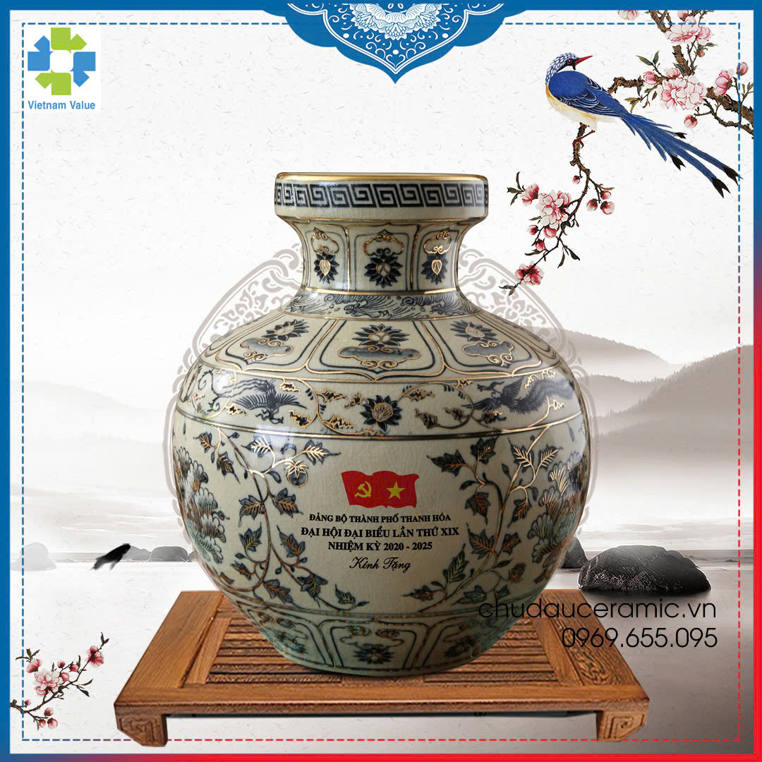 In logo và thương hiệu lên bình phượng hoàng Gốm Chu Đậu - Thương hiệu Quốc gia là món quà ý nghĩa của doanh nghiệp để tri ân khách hàng. Giá niêm yết có thể thay đổi theo họa tiết, thiết kế và số lượng. Liên hệ 0969.655.095 để biết thêm chi tiết.