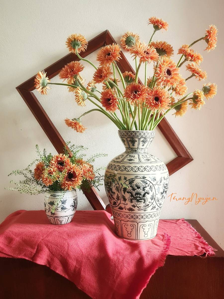 - Sự kết hợp hài hòa giữa hình ảnh hoa cúc đại đóa và hoa sen trên bình càng tôn lên sự sang trọng, cao cấp của món đồ gốm này.