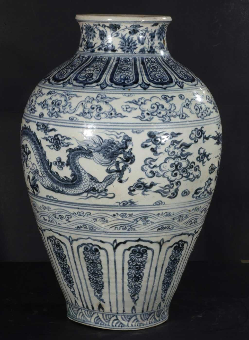 Rồng đuổi, với kỹ thuật tạo dáng và họa pháp với bố cục chặt chẽ trên một chum gốm hoa lam, thế kỷ 15